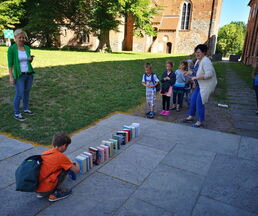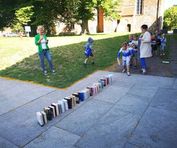 Zuletzt ging es nach draussen, wo es galt, auf Zeit eine Bücherschlange zu bauen. Hierbei wurden die Zeiten aller drei Klassen gemessen und am Ende ausgewertet.