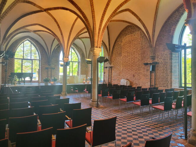 Das Refektorium (barrierefrei) ist für viele Anlässe ein großartiger Veranstaltungsraum. Es ist mit 174 Stühlen in 17 Reihen bestückt und hat eine 8 m x 4 m großen Bühne.